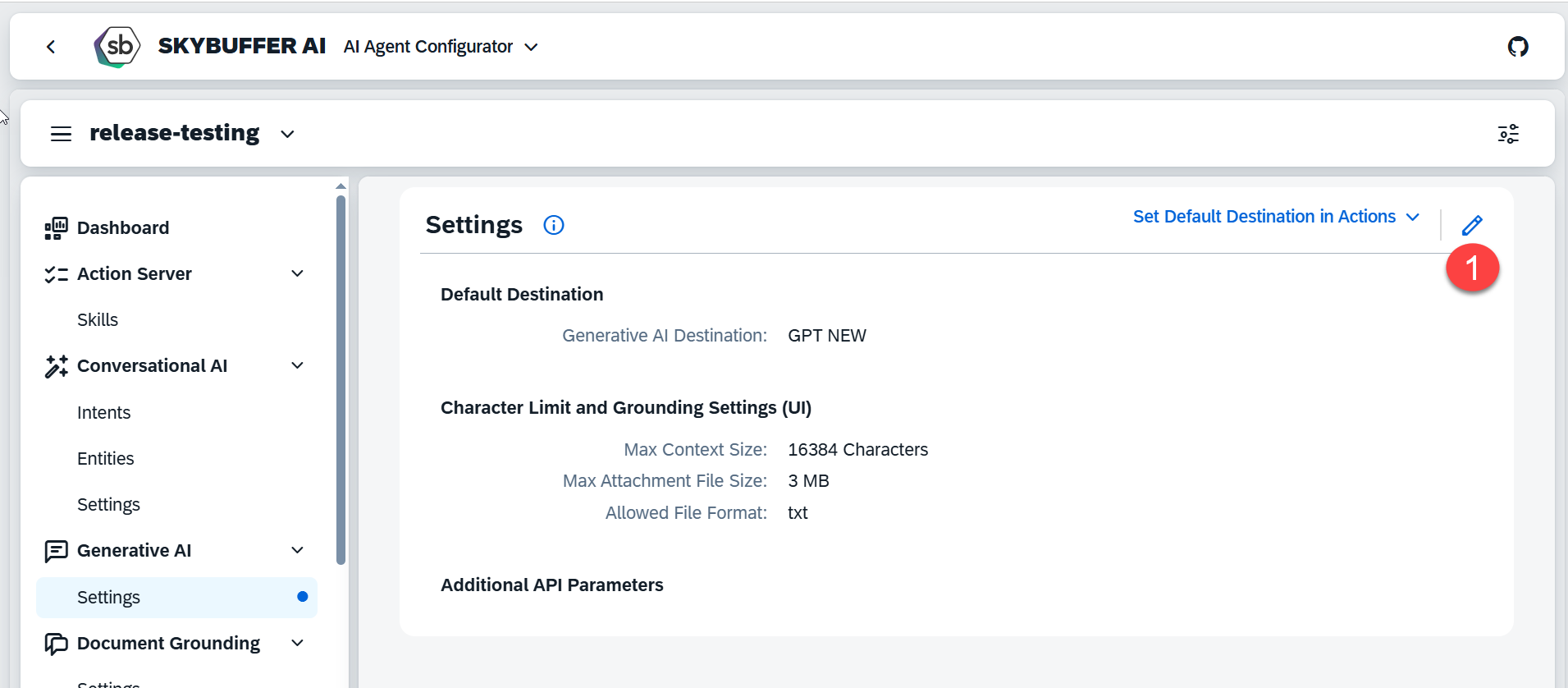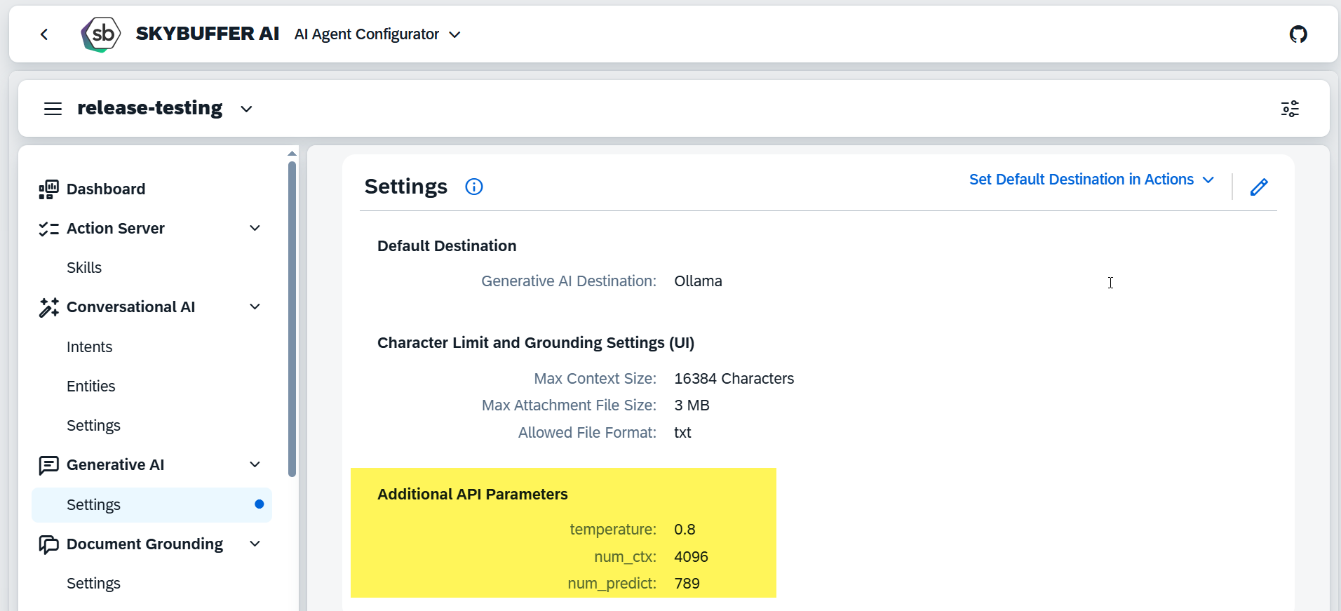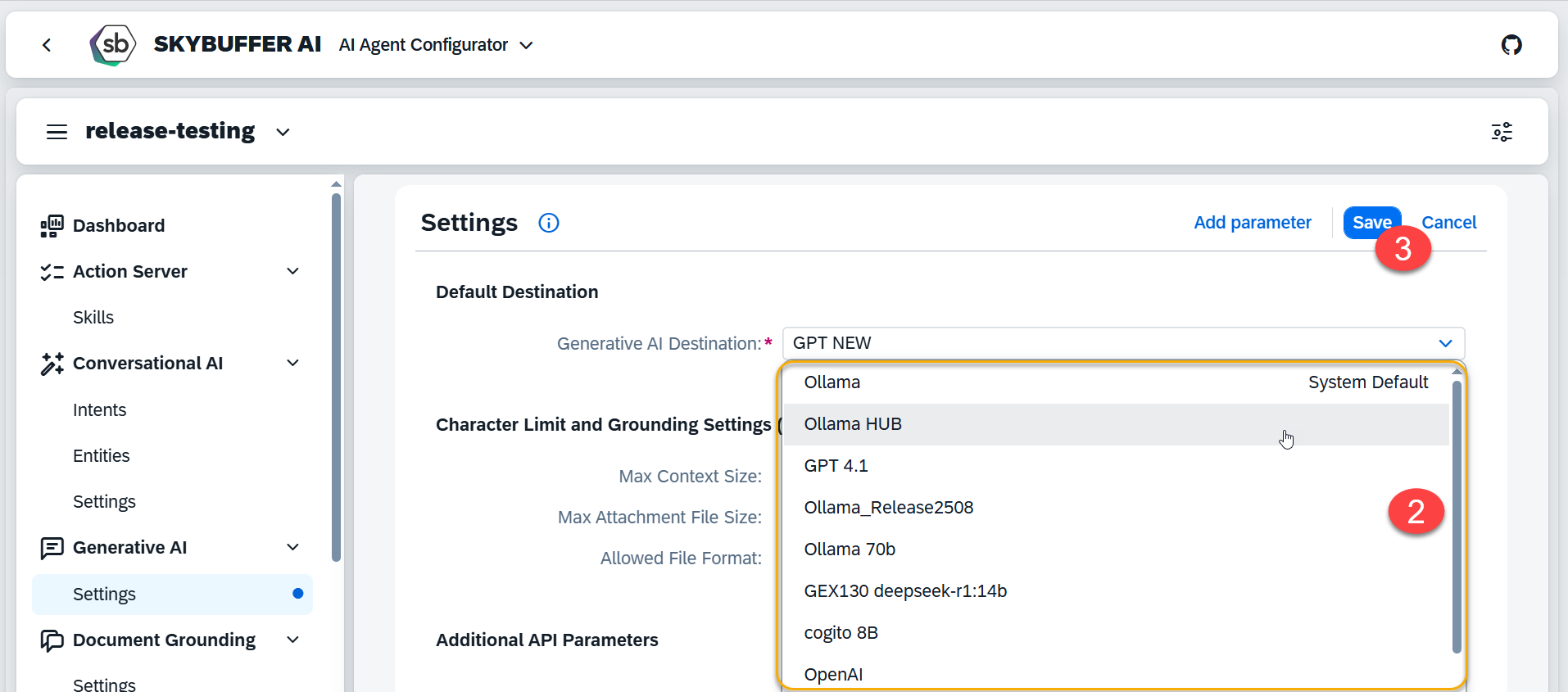 Parameters for the Generative AI Destination are applied by default. You can view these parameters in the AI Agent Configurator application (settings section) for the respective connected Generative AI. To customize the AI’s behavior further, you can redefine existing parameters or add new ones using the Add Parameter function. Save changes in the end.