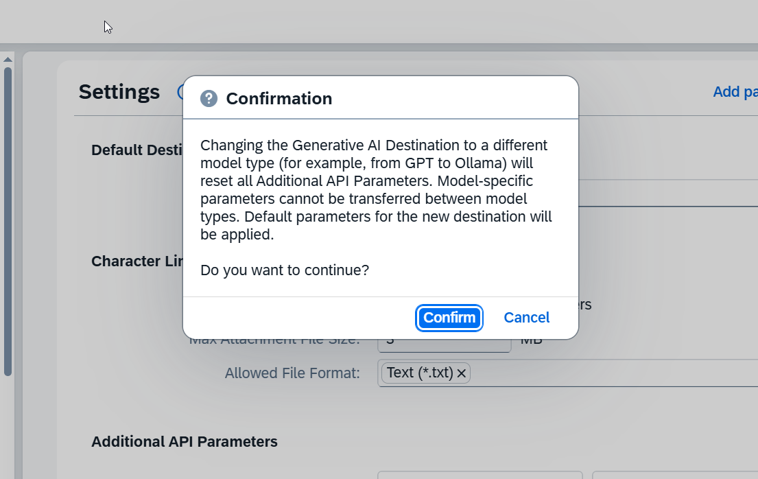 Press Confirm and then Save to change the AI Destination in such case. Additional API Parameters will be resett.