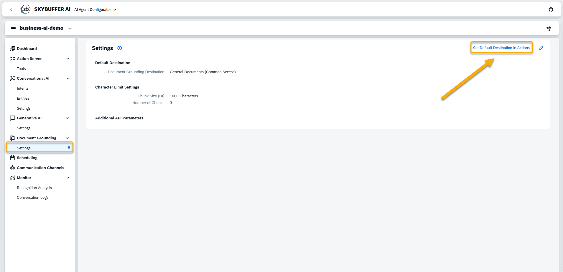 Here, you can set default destinations for all Document Grounding Actions by clicking Set Default Destination in Actions button.