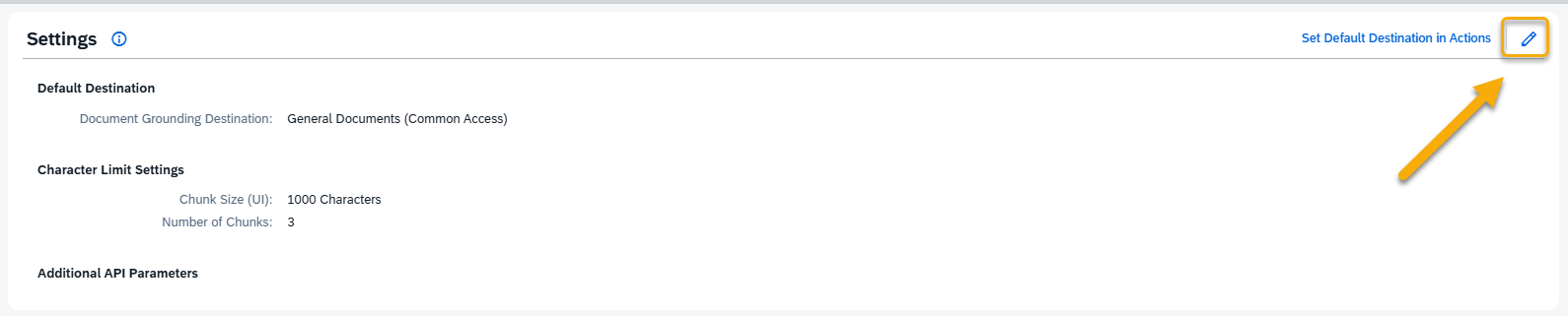 To assign or change the default Document Grounding Destination, select one from the available list.Character Limit Settings (UI)