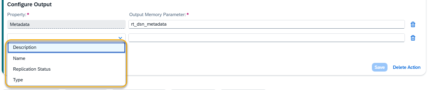 For each selected property, define an output memory parameter where the value will be stored for later processing.