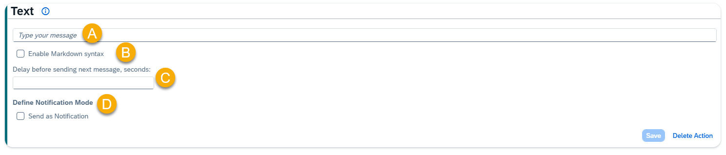 The Text action allows you to display a simple text message within the conversation. It’s ideal for providing responses, instructions, or contextual information.