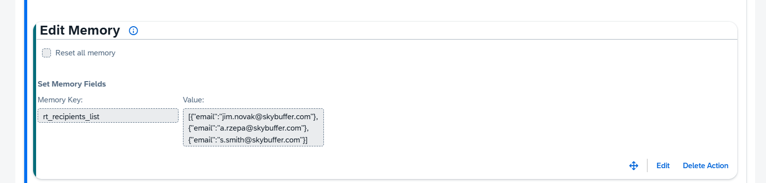 Use an array :[ {“email” : “email@domain.com”}, …] where each person is identified by email at least. Save it into a memory variable of your choice. Here: “rt_recipients_list” is used.
