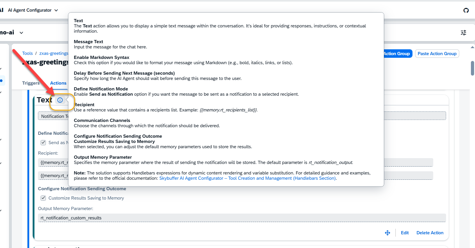 Remember, you can always access Help Dialogue next to each Action to see a quick information on how to set it up. Just press the notification icon at the top of an action:Â