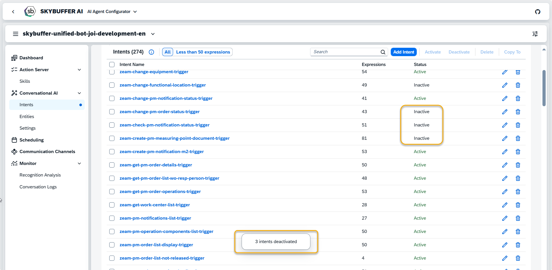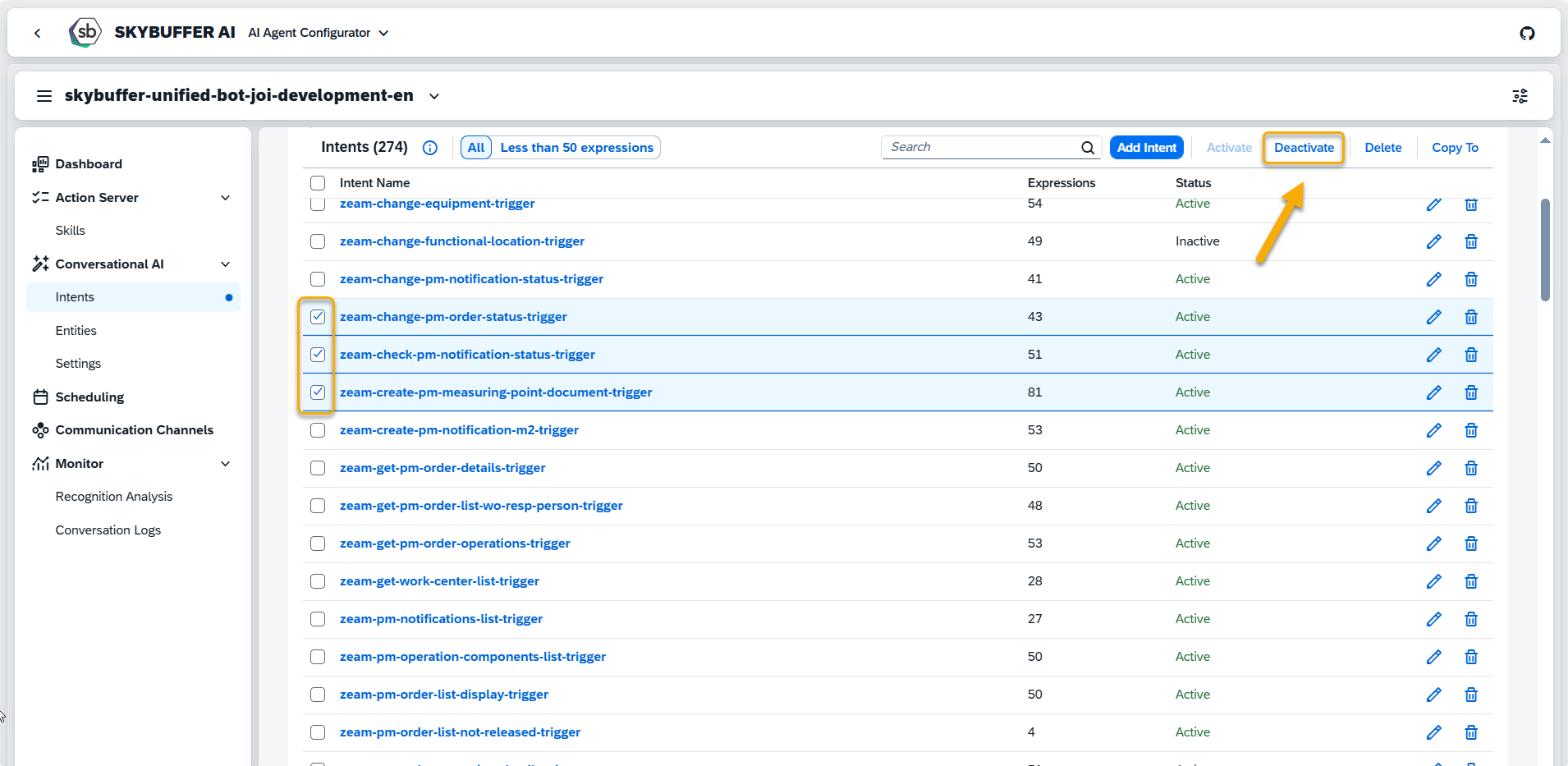 To do this, simply select the intents you want to deactivate for now and click the Deactivate button.