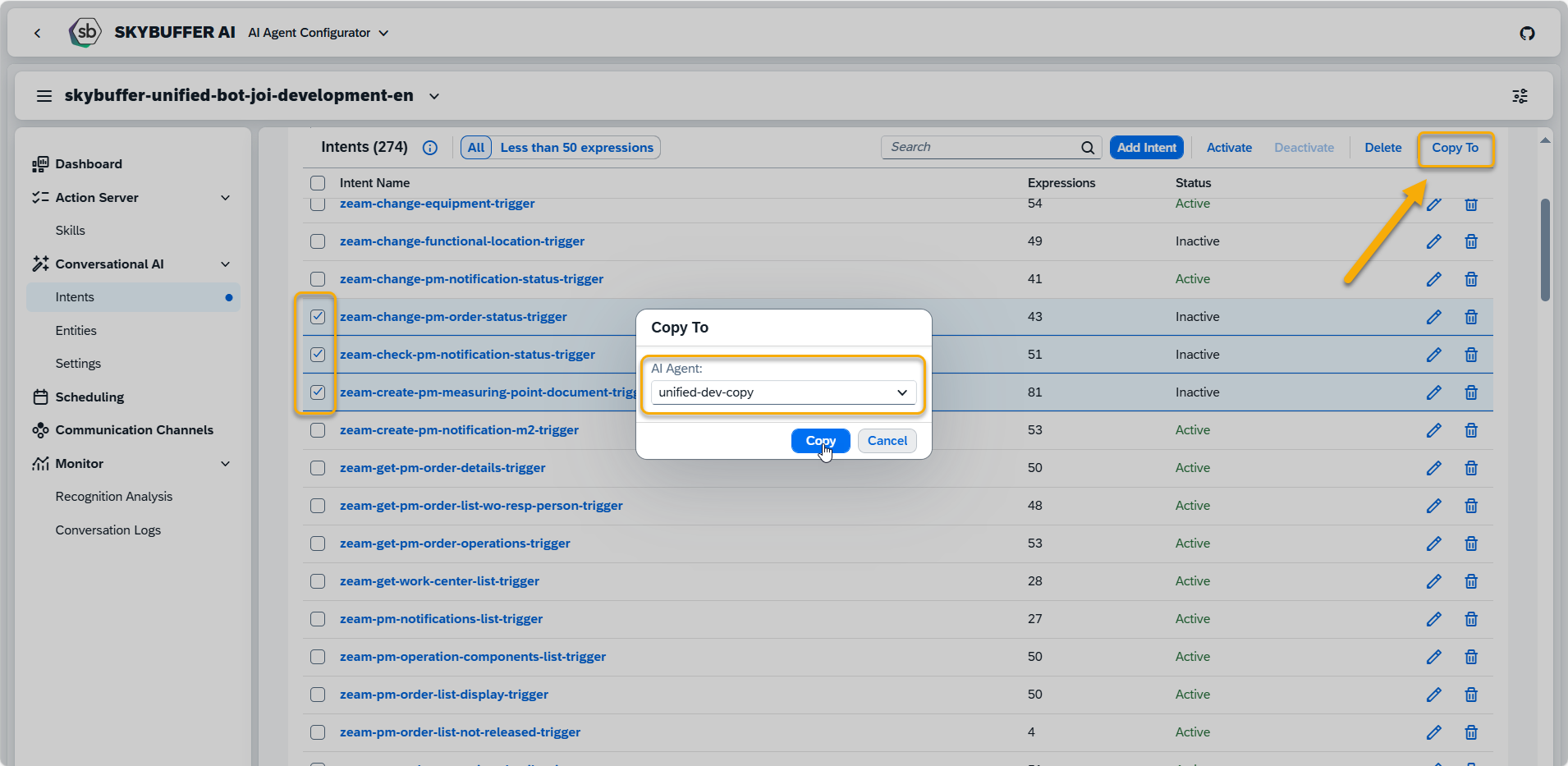 You can also copy your intents to another AI Agent. To do this, select the intents you want to copy and click the Copy to button.