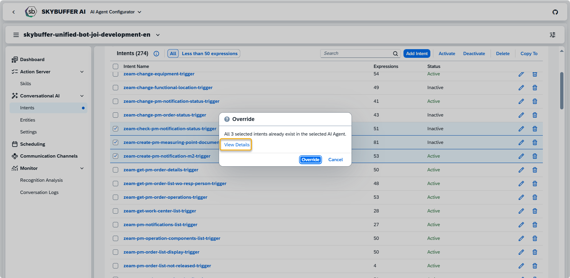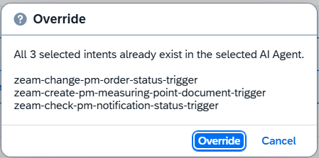If some of the selected intents already exist in the chosen AI Agent, you can click View Details to see which ones are duplicates and decide whether to override them or not.