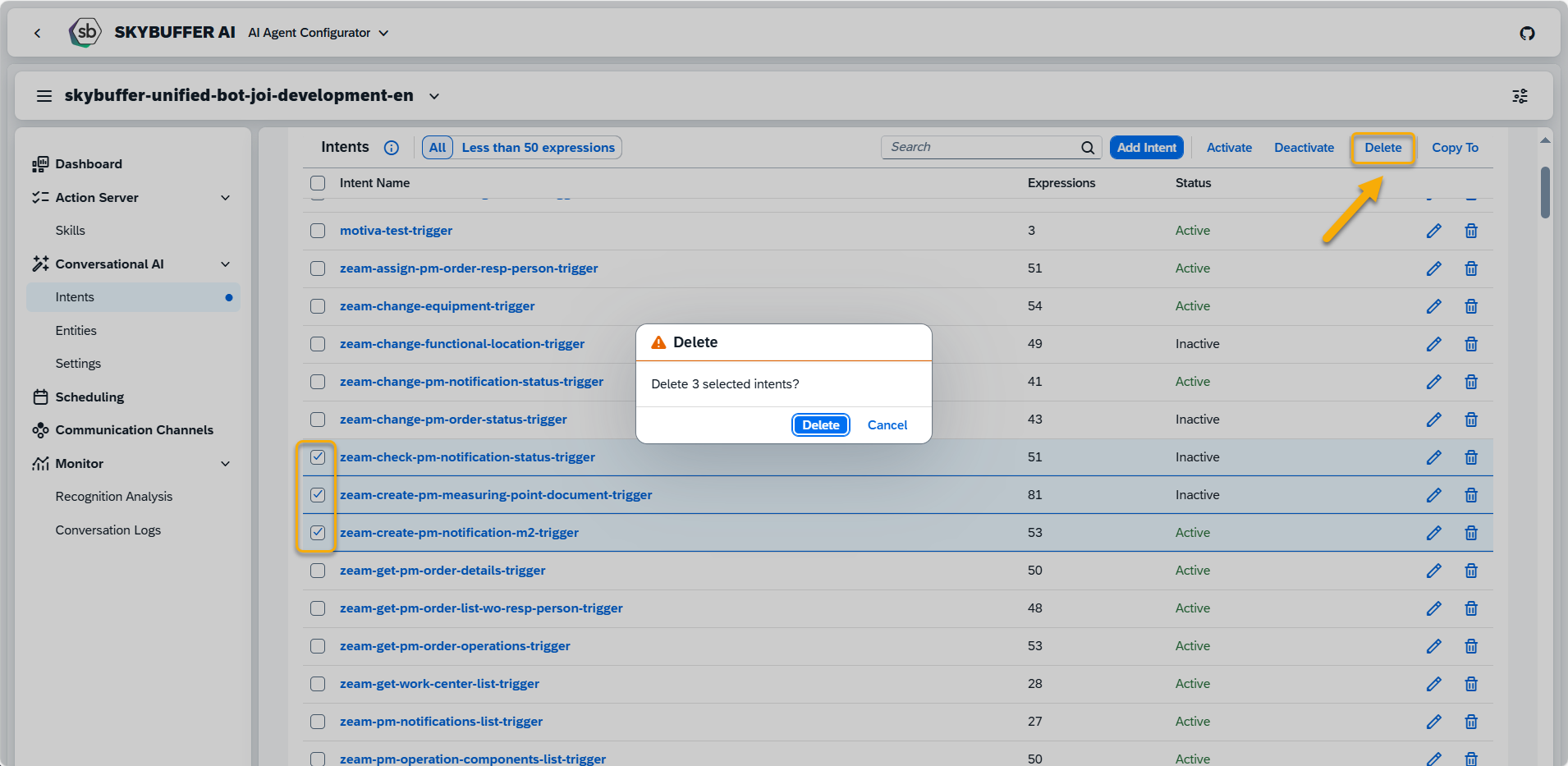 If you no longer need certain intents, you can delete them. Simply select the intents you want to remove and click the Delete button.
