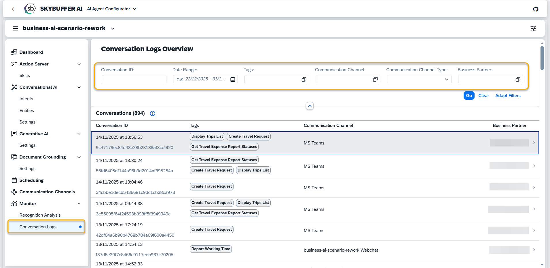 In this section, you can view all conversations handled by the AI Agent. Each conversation includes key information such as the Conversation ID, date and time, communication channel, assigned tags, and the Business Partner name if available.