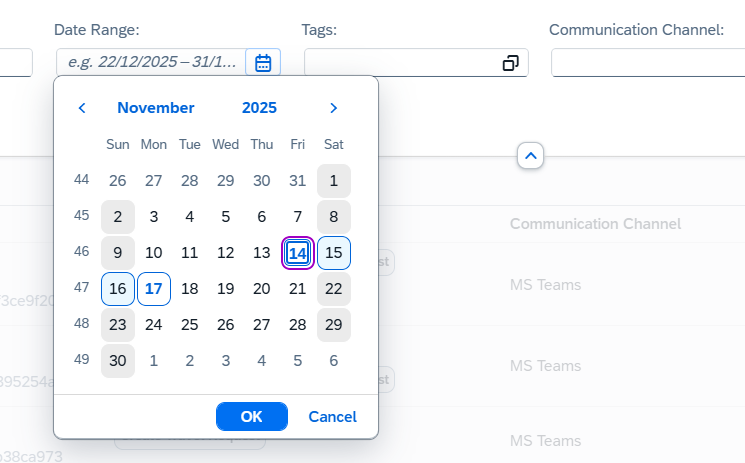 Select a start and end date to display conversations within that timeframe — useful for monitoring specific periods.