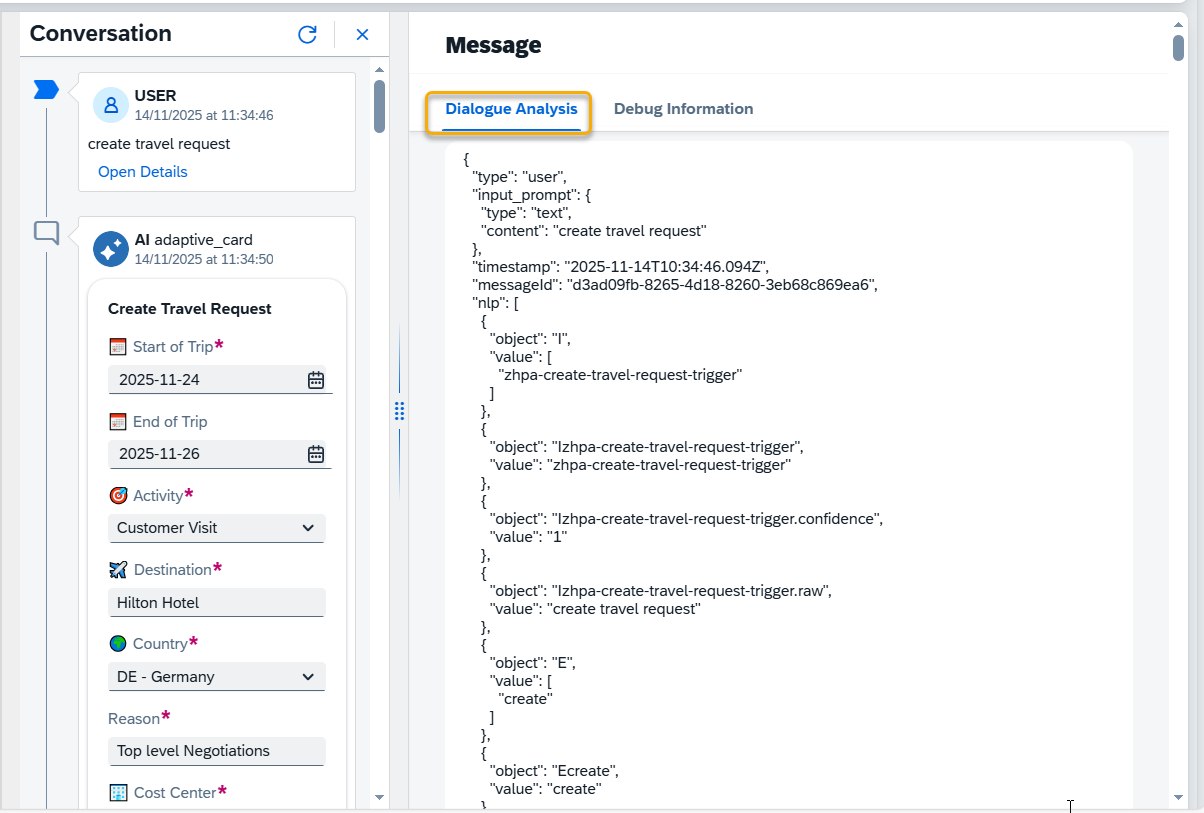 Press the Open Details button under any message and check Dialogue Analysis and Debug Information.