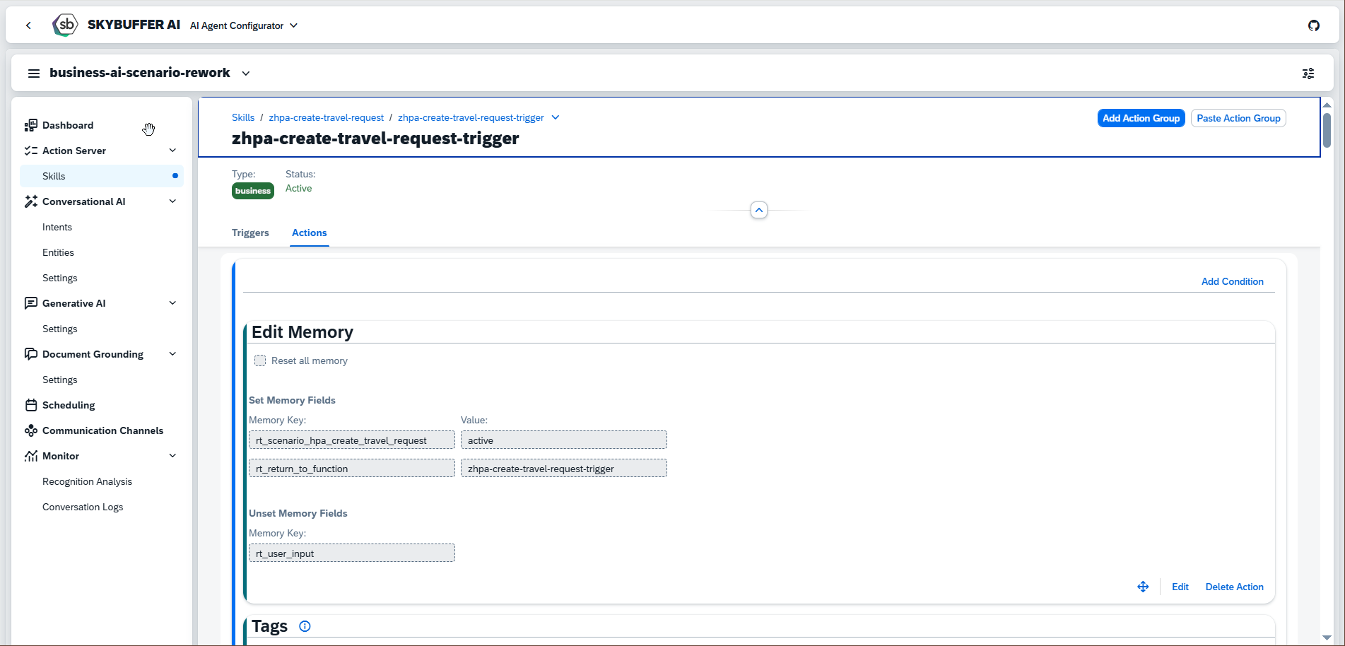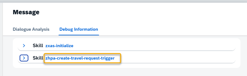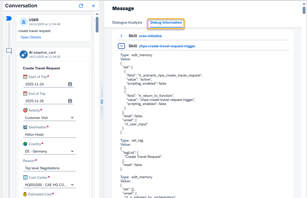 Debug Information shows what skills have been triggered after the user message, and what actions were run inside each skill.