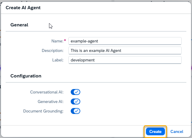 Select the AI functionalities to include in your Agent (e.g., Conversational AI, Generative AI, Document Grounding).