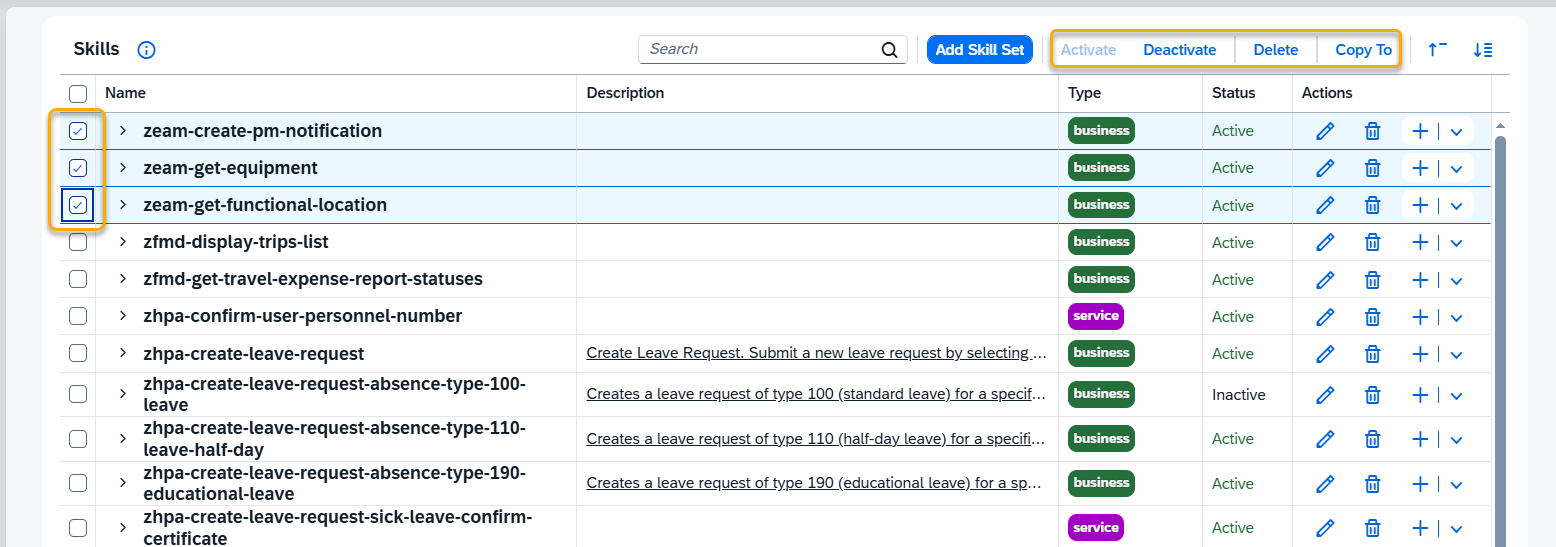 From this place you can also select several skills and activate or deactivate them, as well as delete or copy to another AI Agent