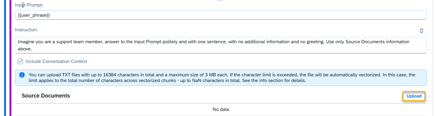 - Important: If the file exceeds the character limit and Document Grounding is activated in your AI Agent, you will receive a prompt to vectorize document for grounded search. This enhances search accuracy by retrieving relevant information from large data sources. If Document Grounding is not enabled or the file still exceeds the limit, the document must be reduced in size or reworked to fit within the allowed character count.