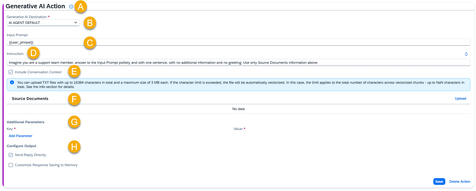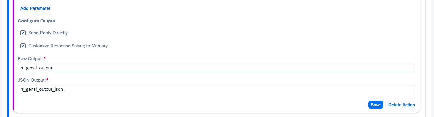 Parameters for the Generative AI Destination are applied by default. You can view these parameters in the AI Agent Configurator application (settings section) for the respective connected Generative AI. To customize the AI’s behavior further, you can redefine existing parameters or add new ones using the Add Parameter function. Save changes in the end.