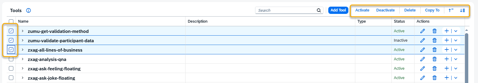 From this place you can also select several tools and activate or deactivate them, as well as delete or copy to another AI Agent.