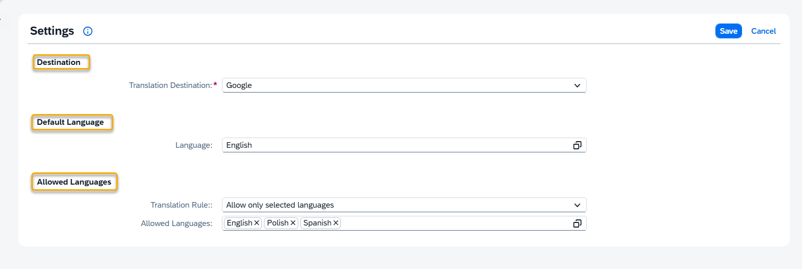 Translation Rule defines which languages may be used for translation. Depending on the rule selected, an additional field will appear with a list of languages to configure.