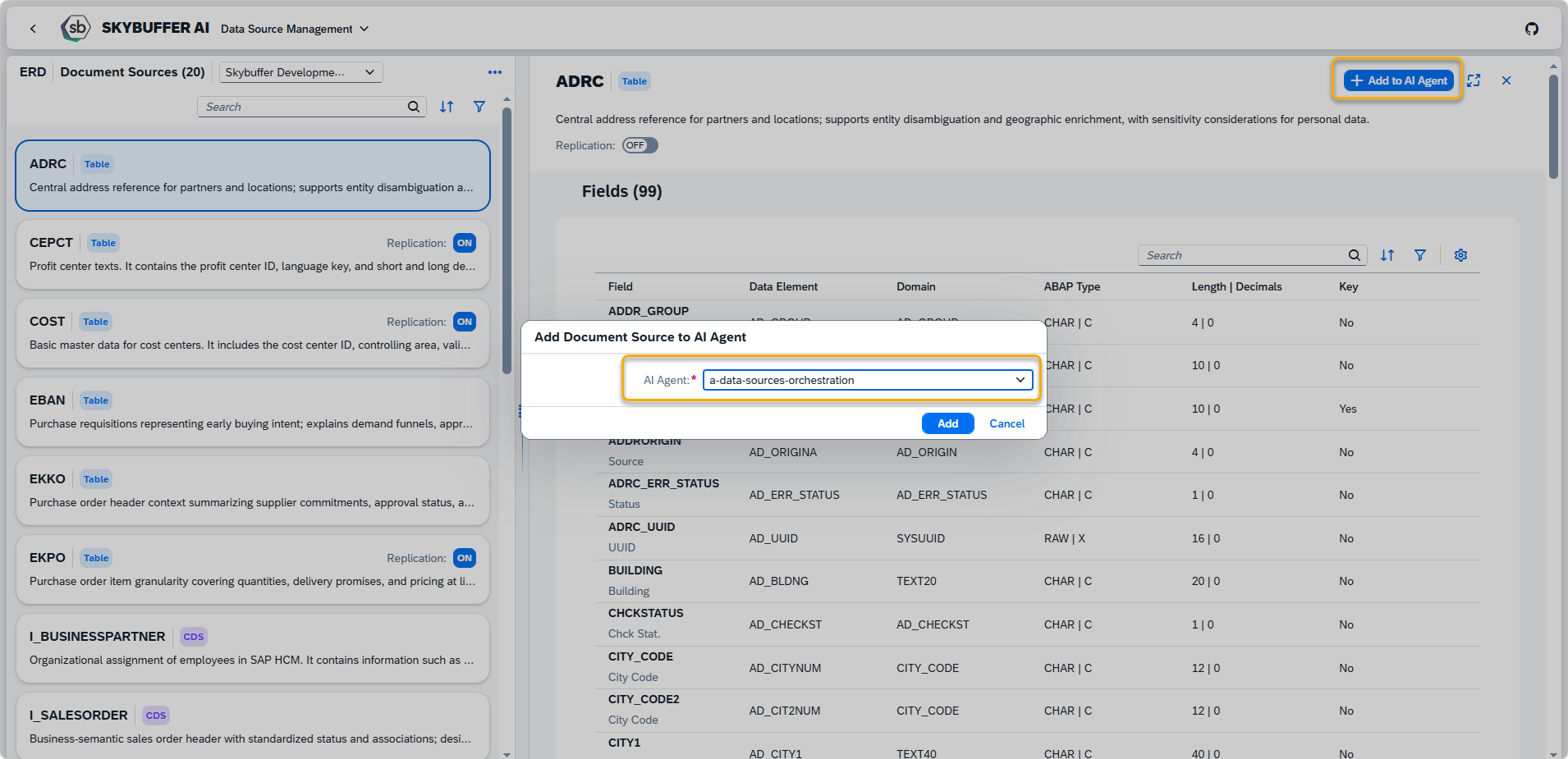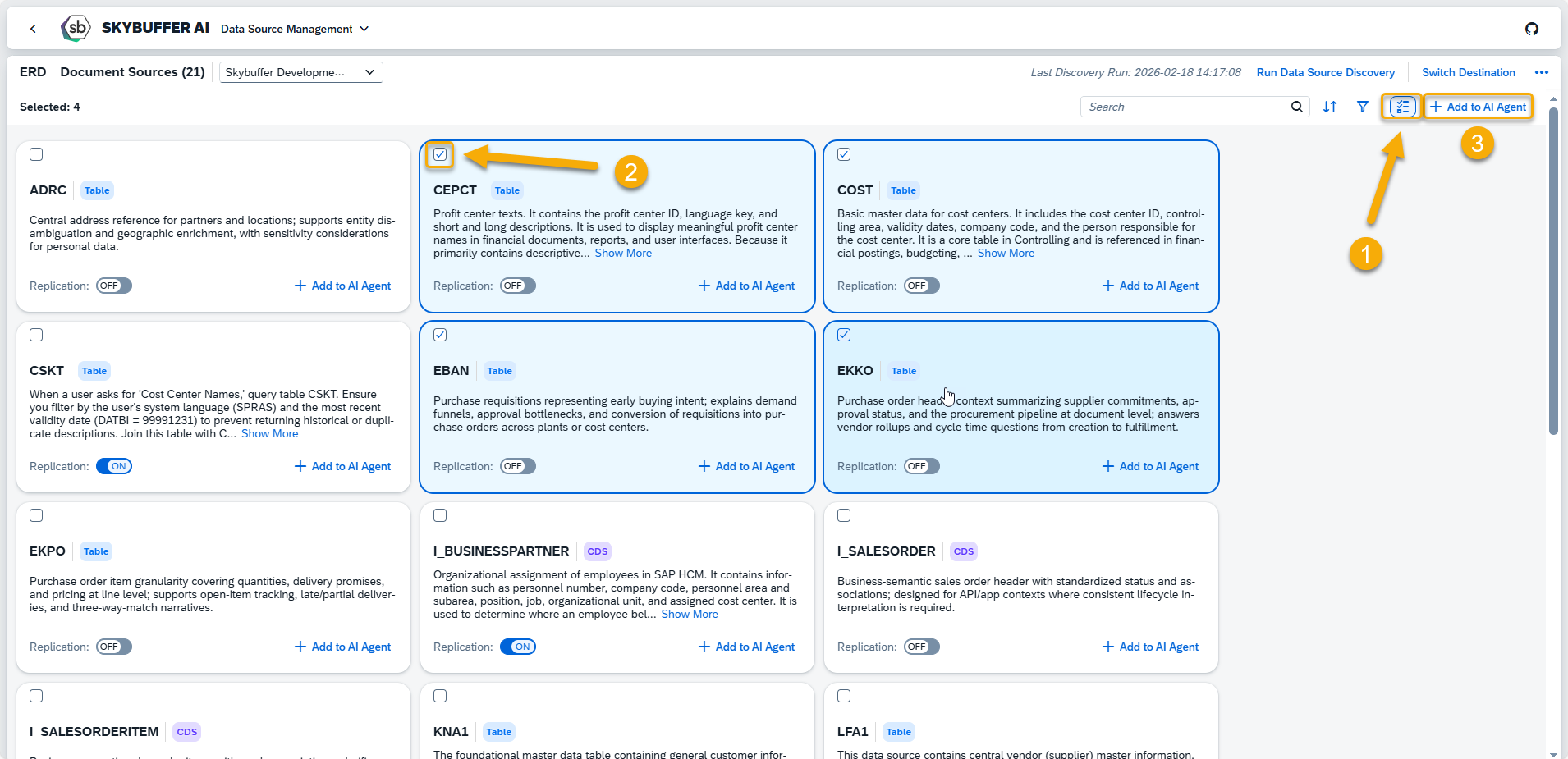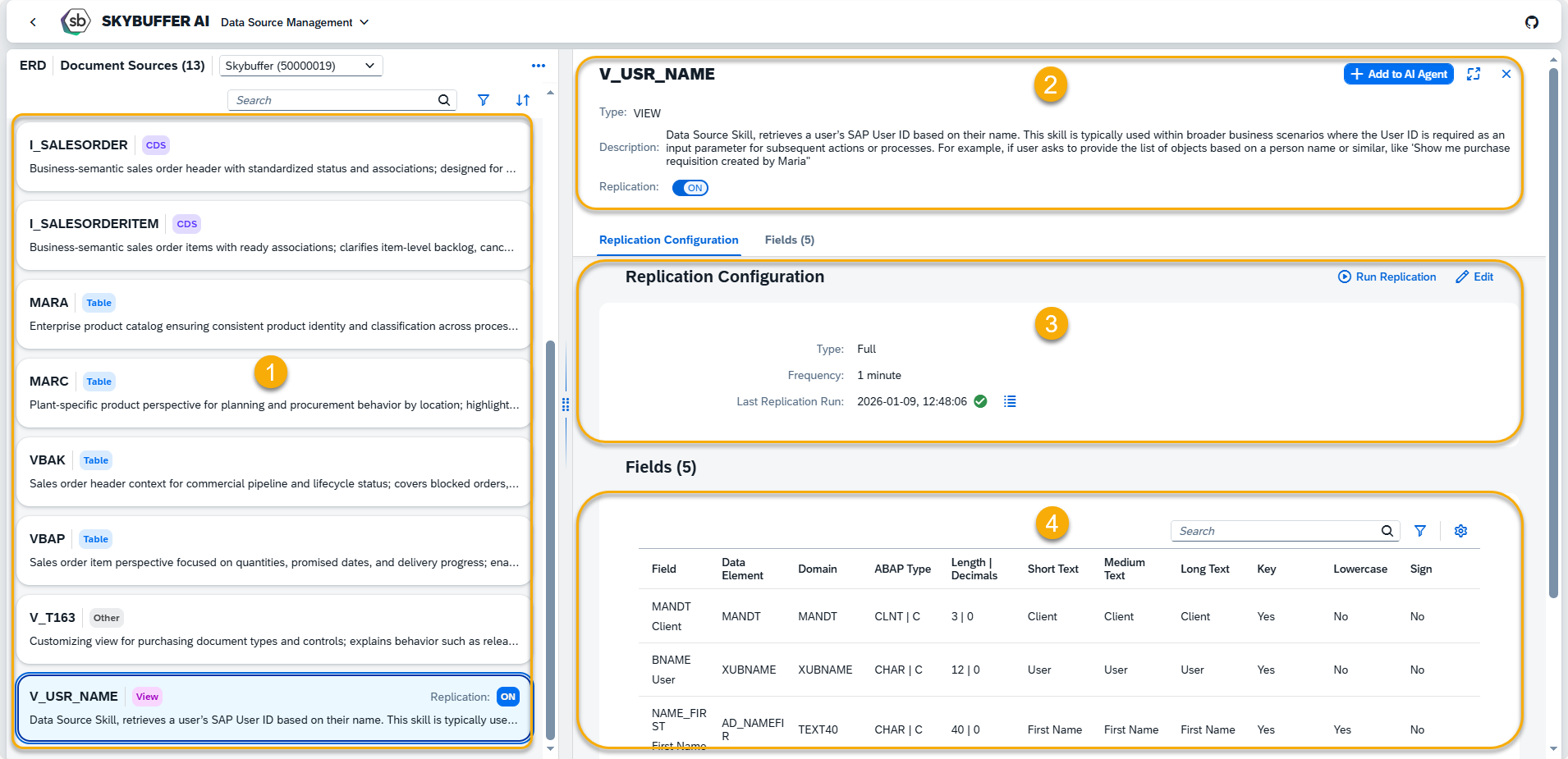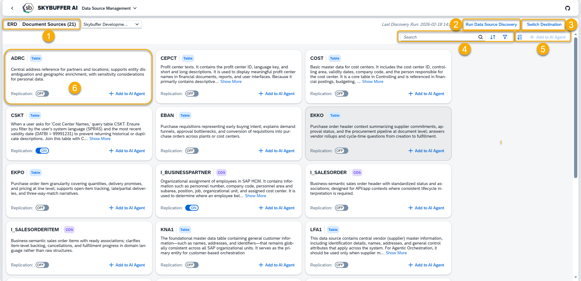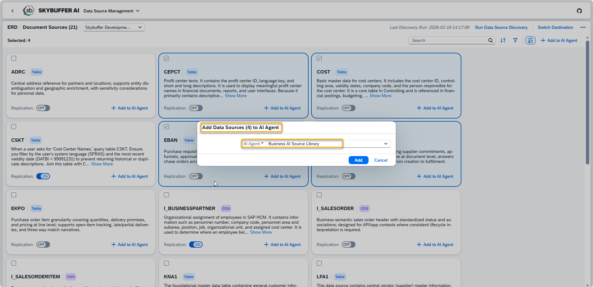 Data Source Scenarios Management is an application that enables SAP data sources to be used in AI Agent conversations. It supports the configuration of system destinations, discovery of available data sources, management of their replication for Retrieval-Augmented Generation (RAG), and assignment of selected sources to AI Agents.
