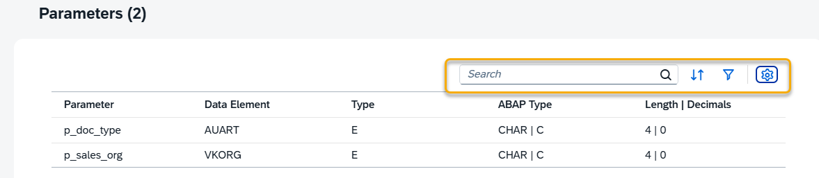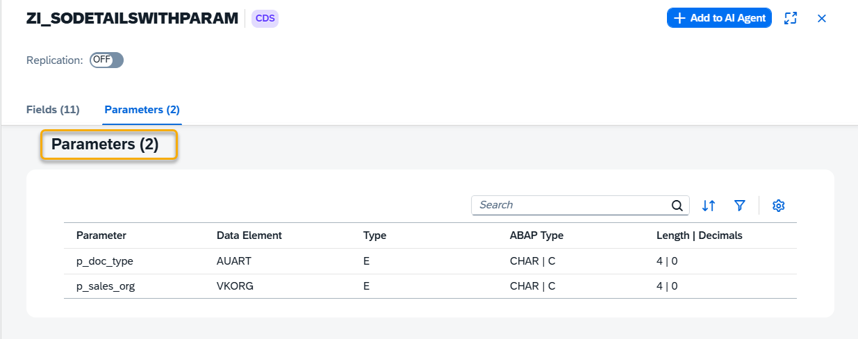 If the selected data source is a parameterized CDS view, a Parameters section is displayed in the details view.