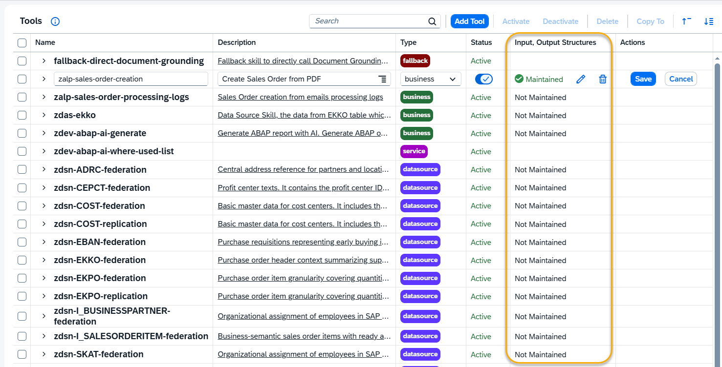 - For Business Tools, input values are provided by the AI Agent or previous steps. You must provide the input json structure to enable Business tool to be used by MCP server or A2A interface.