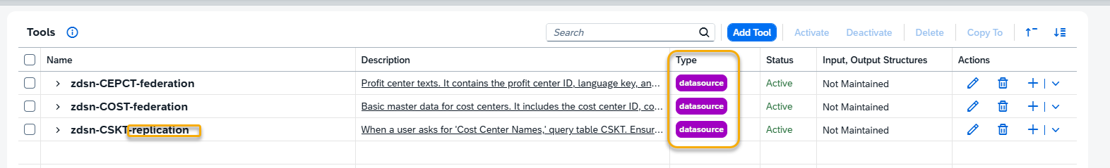All such tools are created with the type “datasource”, enabling the AI Agent to access and use the replicated data during runtime.