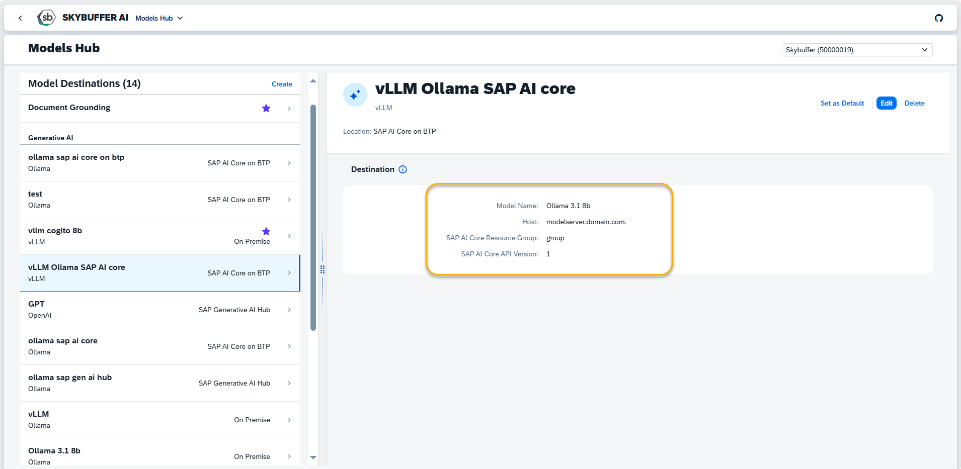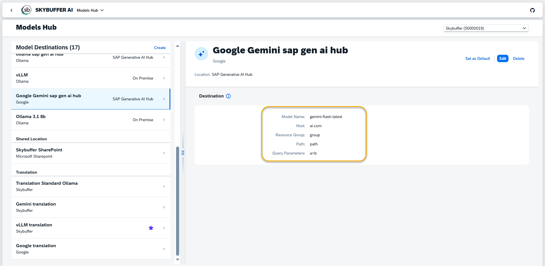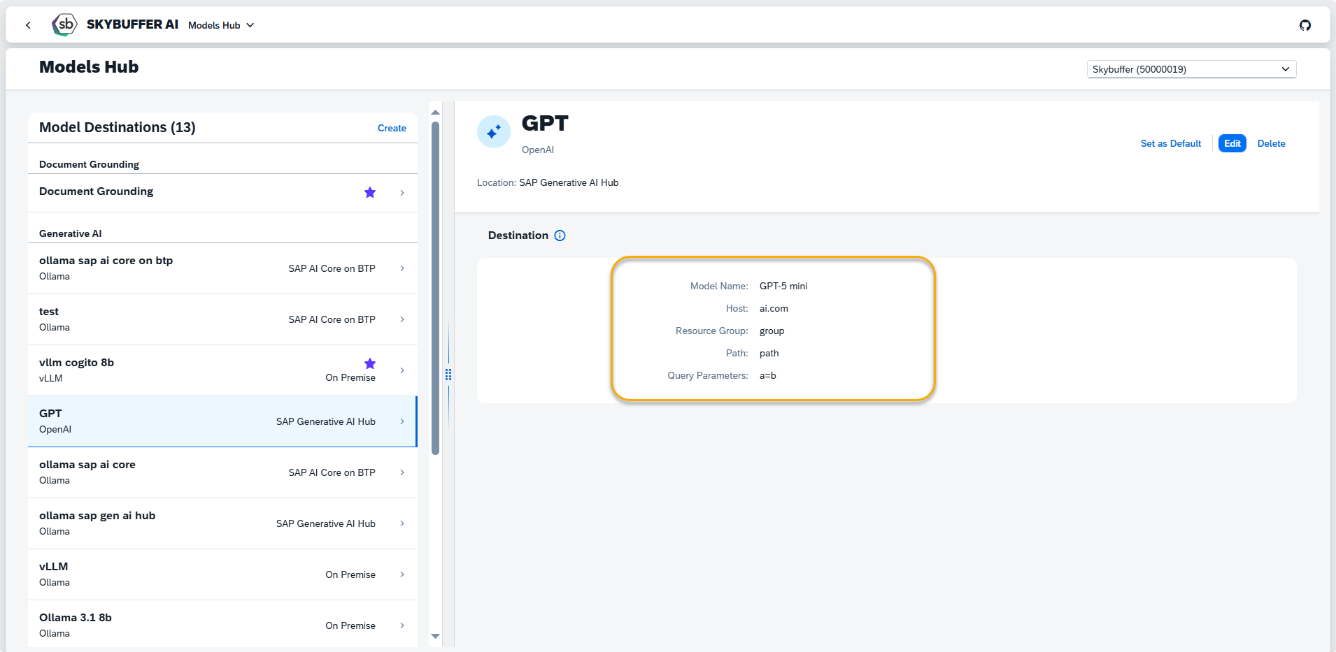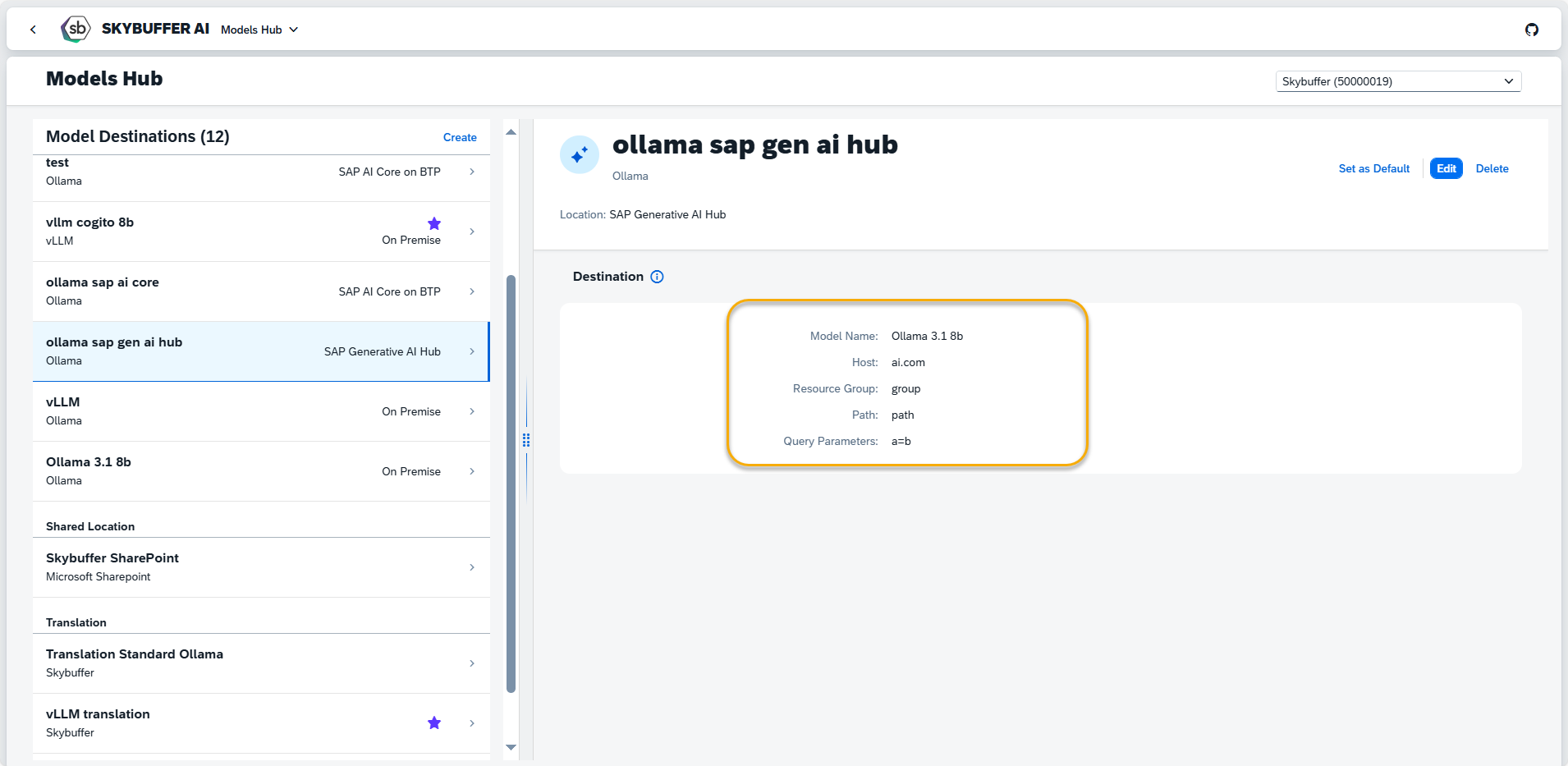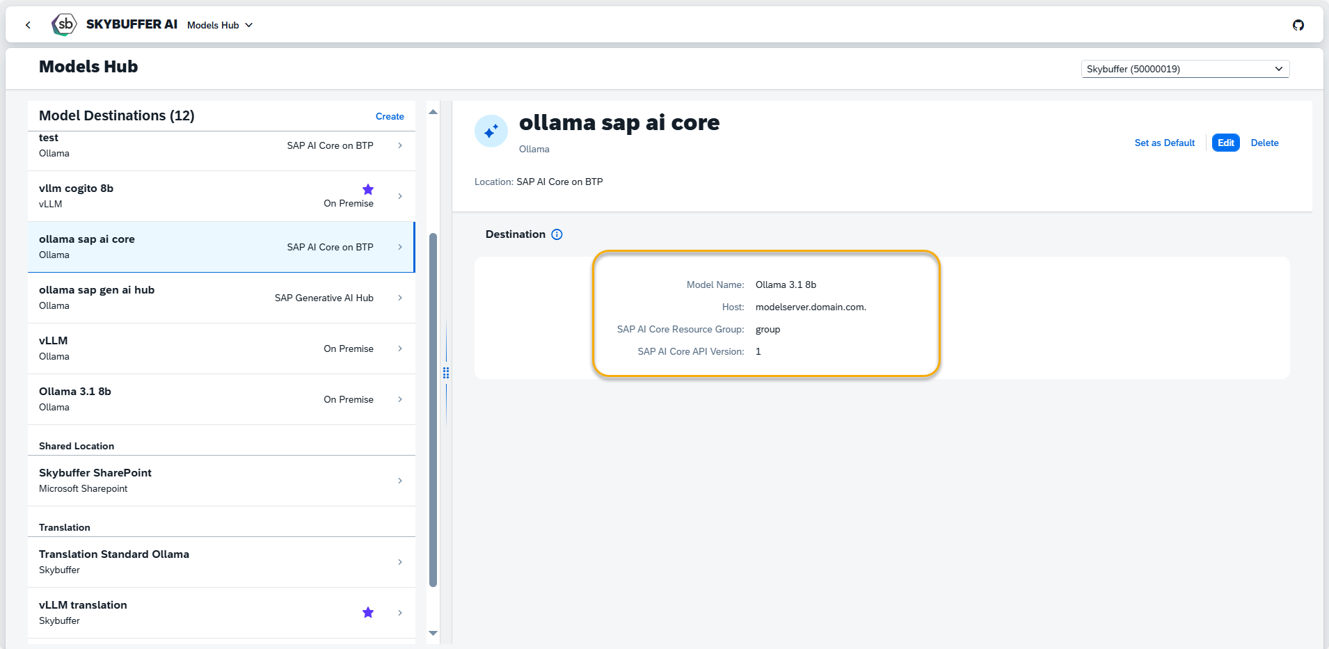 You can set your Model Destination as Default by pressing the button in the top right-hand corner. Default Destiantions are marked with a star and will be usedduring AI Agent creation as preselected destination.