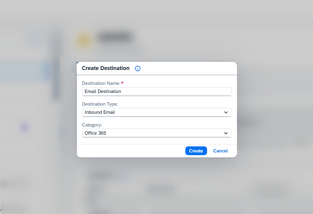 Enter a custom name in Destination Name, choose Inbound Email under Destination Type, specify the provider in Category, and click Create.