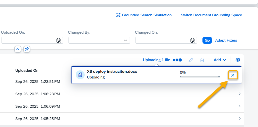 Click Upload to send the document to the Document Grounding System and start vectorization process.