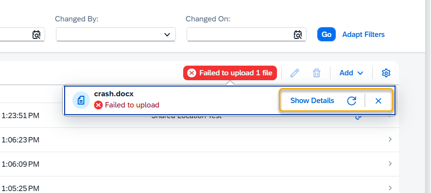 If your upload was unsuccessful for any reason, you can re-upload the file, view details about why the upload failed, or cancel and remove the file.