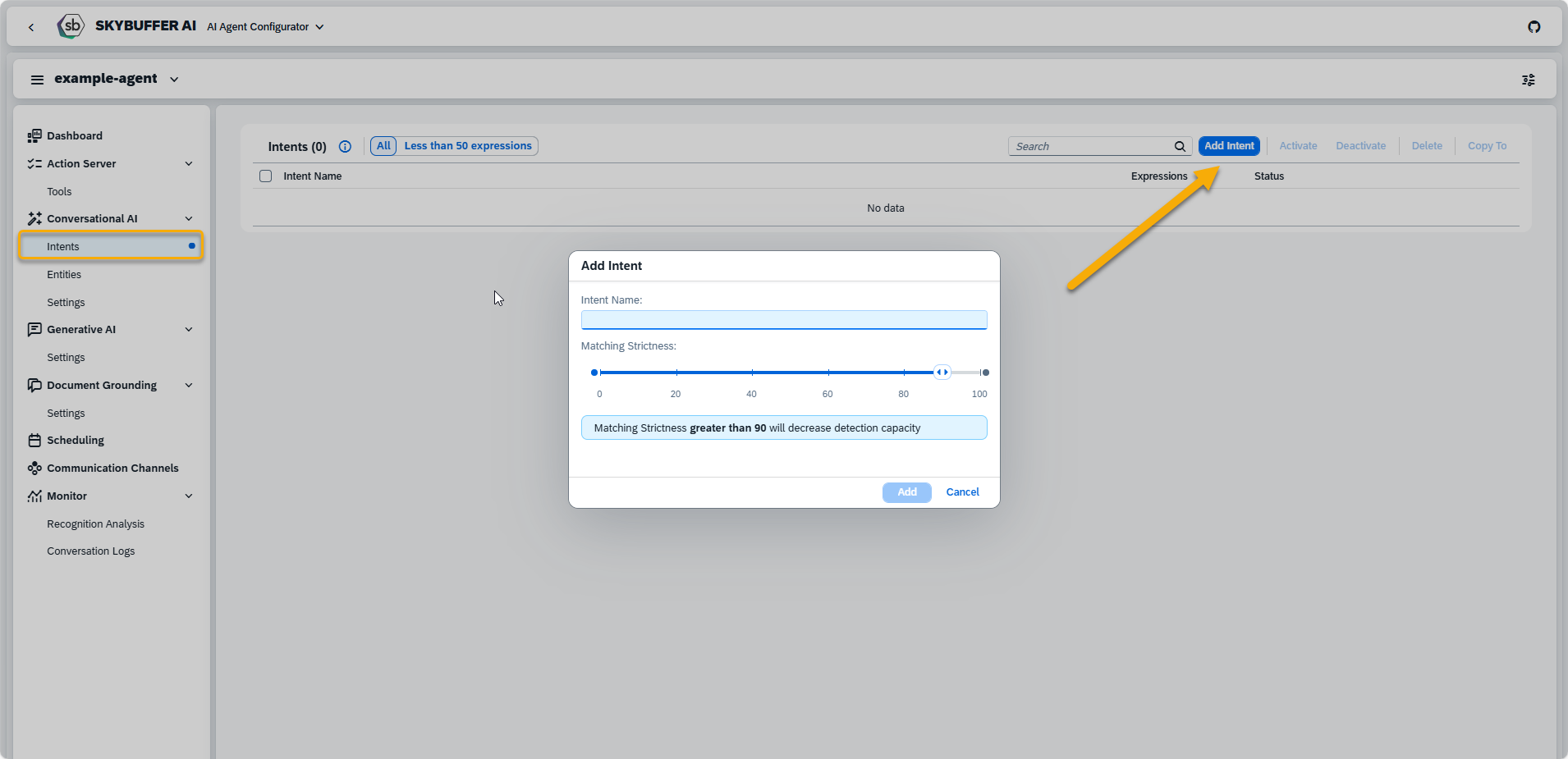 Enter the intent name, adjust the strictness level as needed, and click Add.