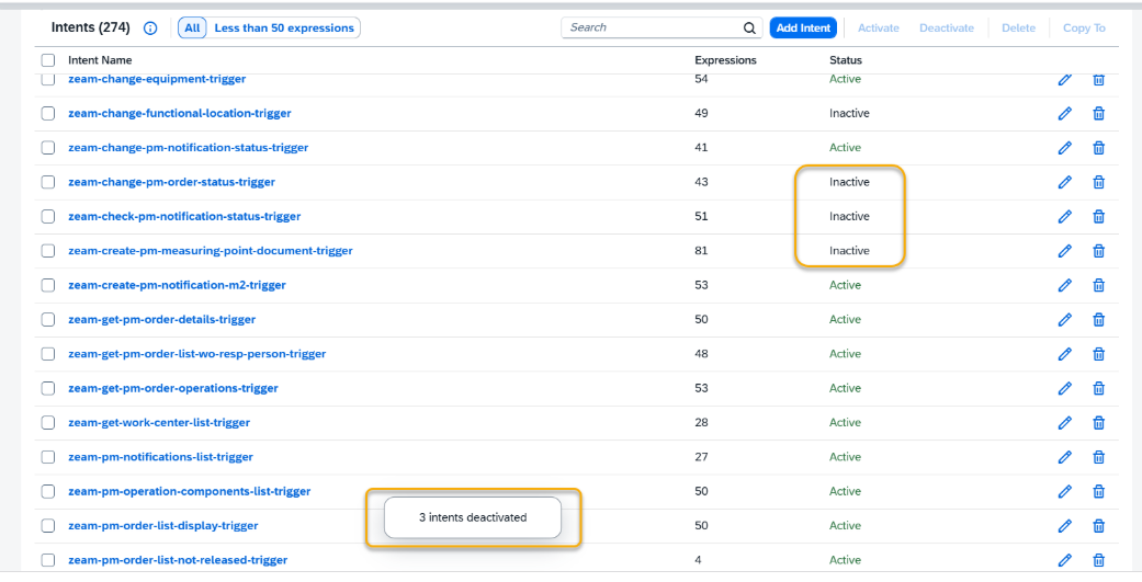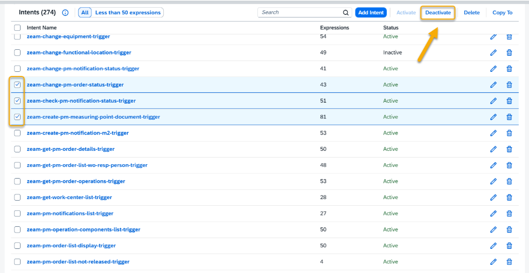 To do this, simply select the intents you want to deactivate for now and click the Deactivate button.