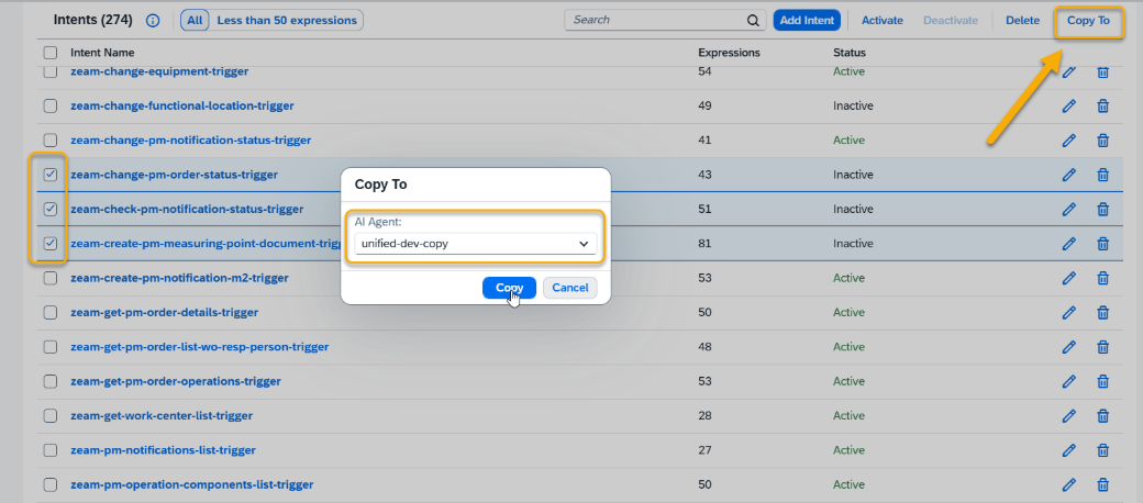 You can also copy your intents to another AI Agent. To do this, select the intents you want to copy and click the Copy to button.