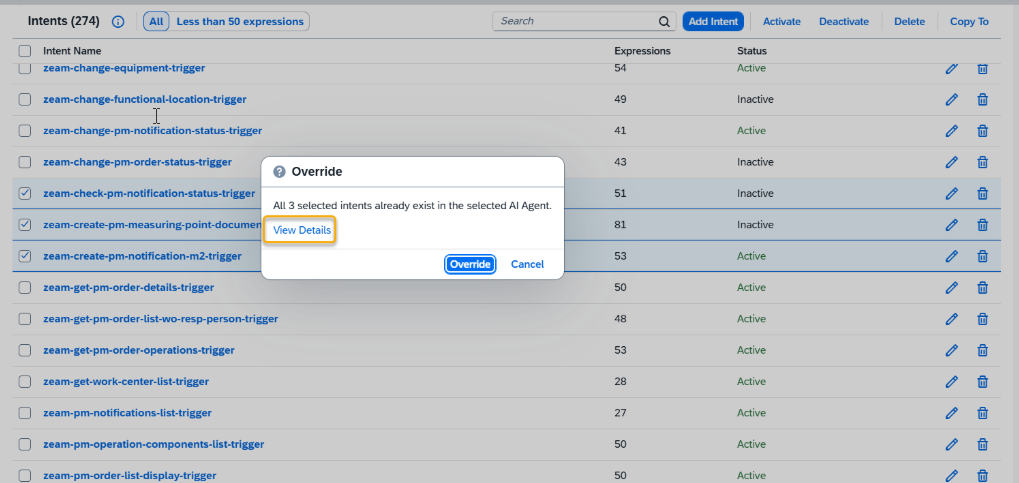 If some of the selected intents already exist in the chosen AI Agent, you can click View Details to see which ones are duplicates and decide whether to override them or not.