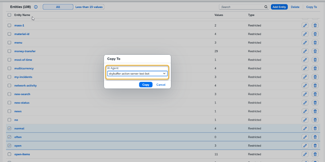 You can also copy your entities to another AI Agent. To do this, select entities you want to copy and click the Copy to button.