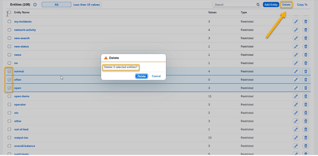If you no longer need certain entities, you can delete them. Simply select entities you want to remove and click the Delete button.