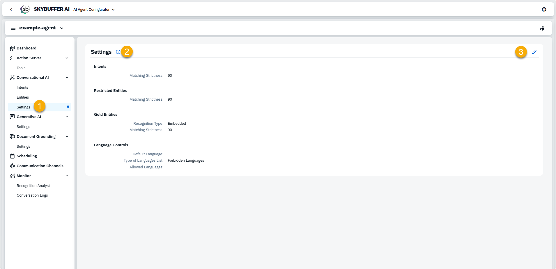 Open the Settings tab (1) in the Conversational AI section on the left. Click on the information icon (2) to understand the options. Click on the Edit (3) button to change them.