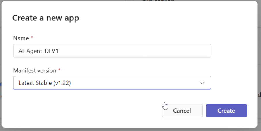 Select New app. Fill in the Name and Manifest version and click on the Create button.