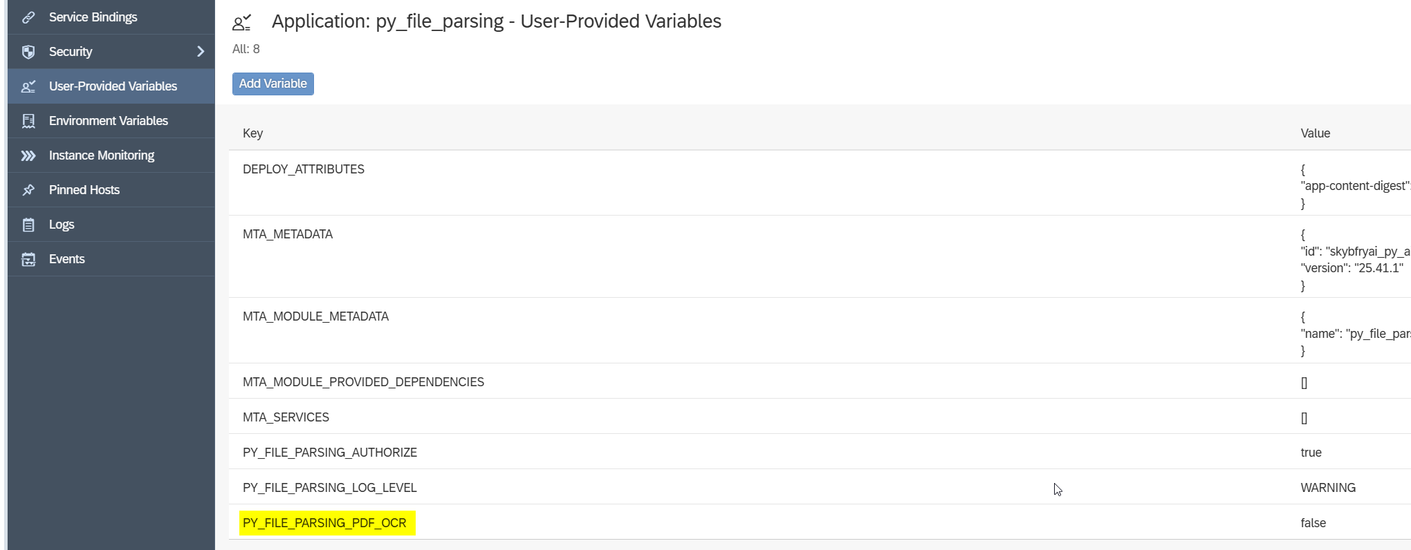 To turn it on we need go to User-Provided Variables of py_file_parsing app and find PY_FILE_PARSING_PDF_OCR, next click modify (pencil icon) and change from “false” to “true”.